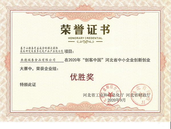2020年“创客中国”河北省中小企业创新创业大赛中荣获企业组优胜奖