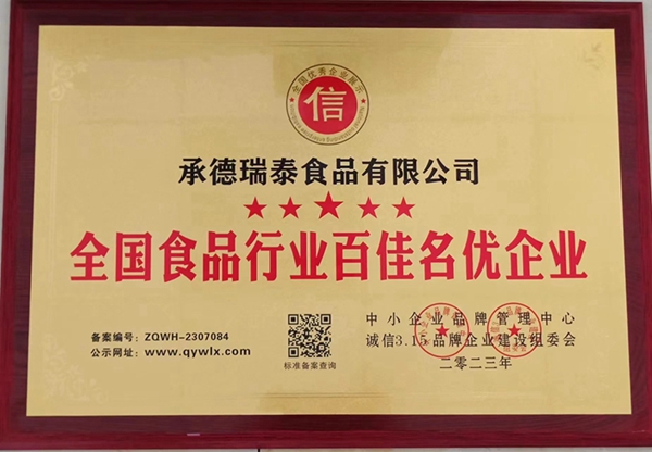 您的位置::首页荣誉资质2023年**食品行业百佳名优企业牌匾